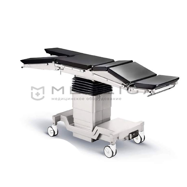 Универсальный операционный стол с расширенными электрогидравлическими регулировками высоты, продольных и латеральных наклонов ложа, наклона секции спины и регулировки высоты торакального "моста" (почечного валика).