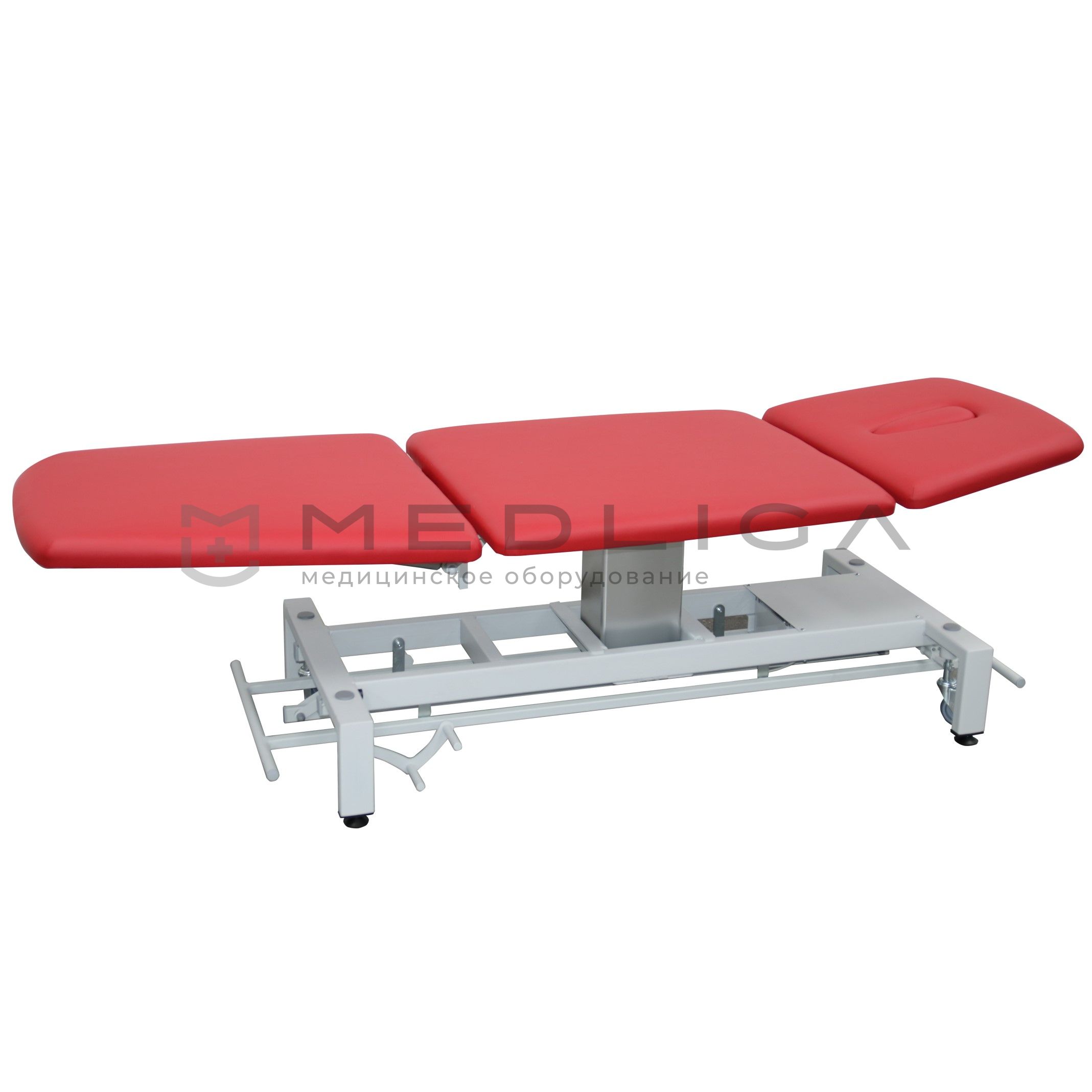 - Конструкция, которая предусматривает удобную регулировку высоты стола ногой с любой стороны посредством специального рамного переключателя, позволяет применять его с максимальным комфортом в самых различных областях медицины (ЛФК, кинезотерапия, мануальная терапия, массаж).