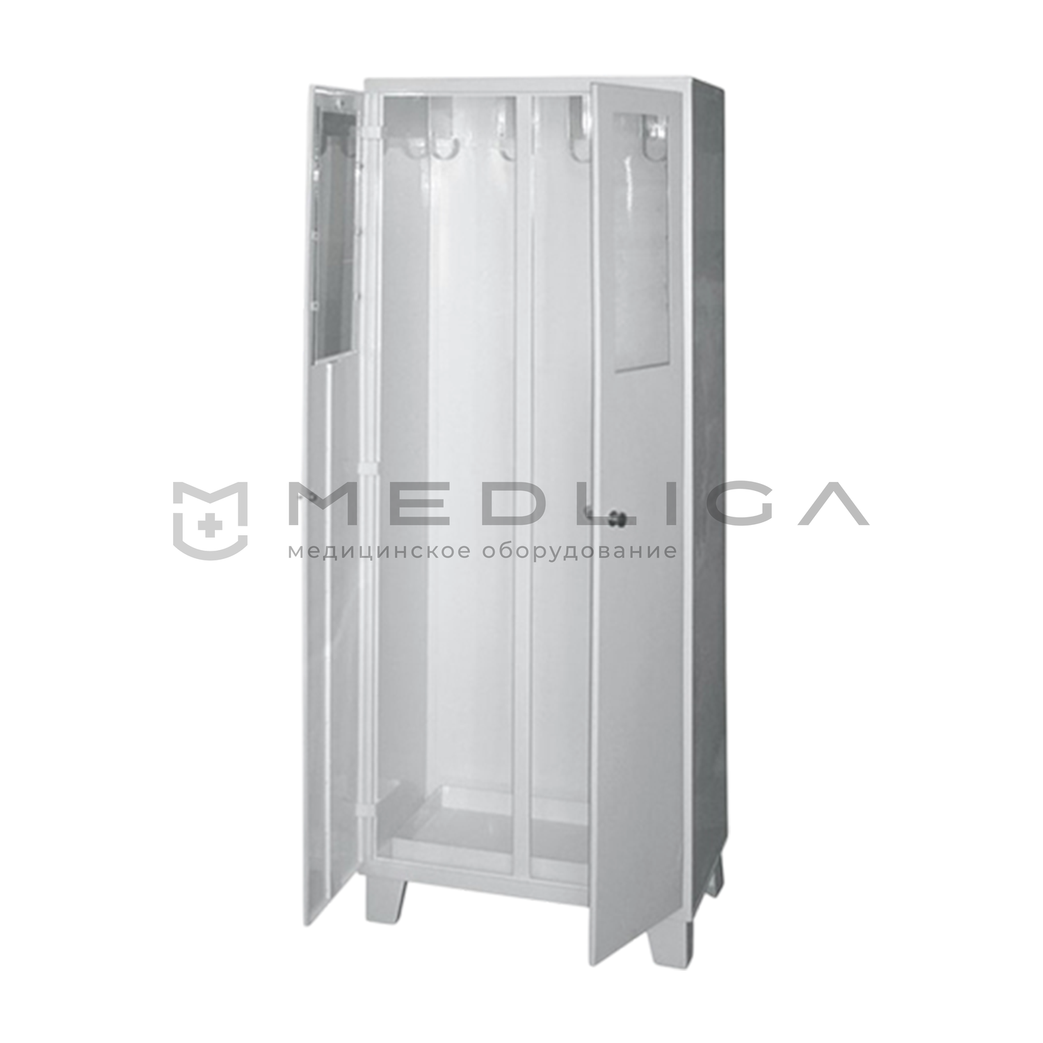 Цельносварной корпус из листовой стали толщиной 1,0 мм с порошково-полимерным покрытием устойчив к агрессивным средам и механическим воздействиям. Двухстворчатая конструкция с закаленными стеклами 190×500 мм обеспечивает визуальный контроль оборудования без нарушения режима хранения. Конические ножки высотой 100 мм исключают коррозию при частой влажной уборке.
