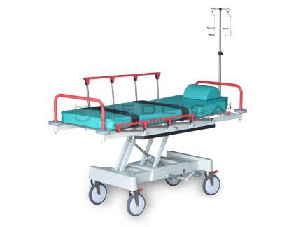 Мягкий матрас, складывающиеся боковые ограждения, бесступенчатое регулирование положениями спинной секции при помощи пневмопружины делают тележку ТБП-01 удобной, комфортной и безопасной для пациента.