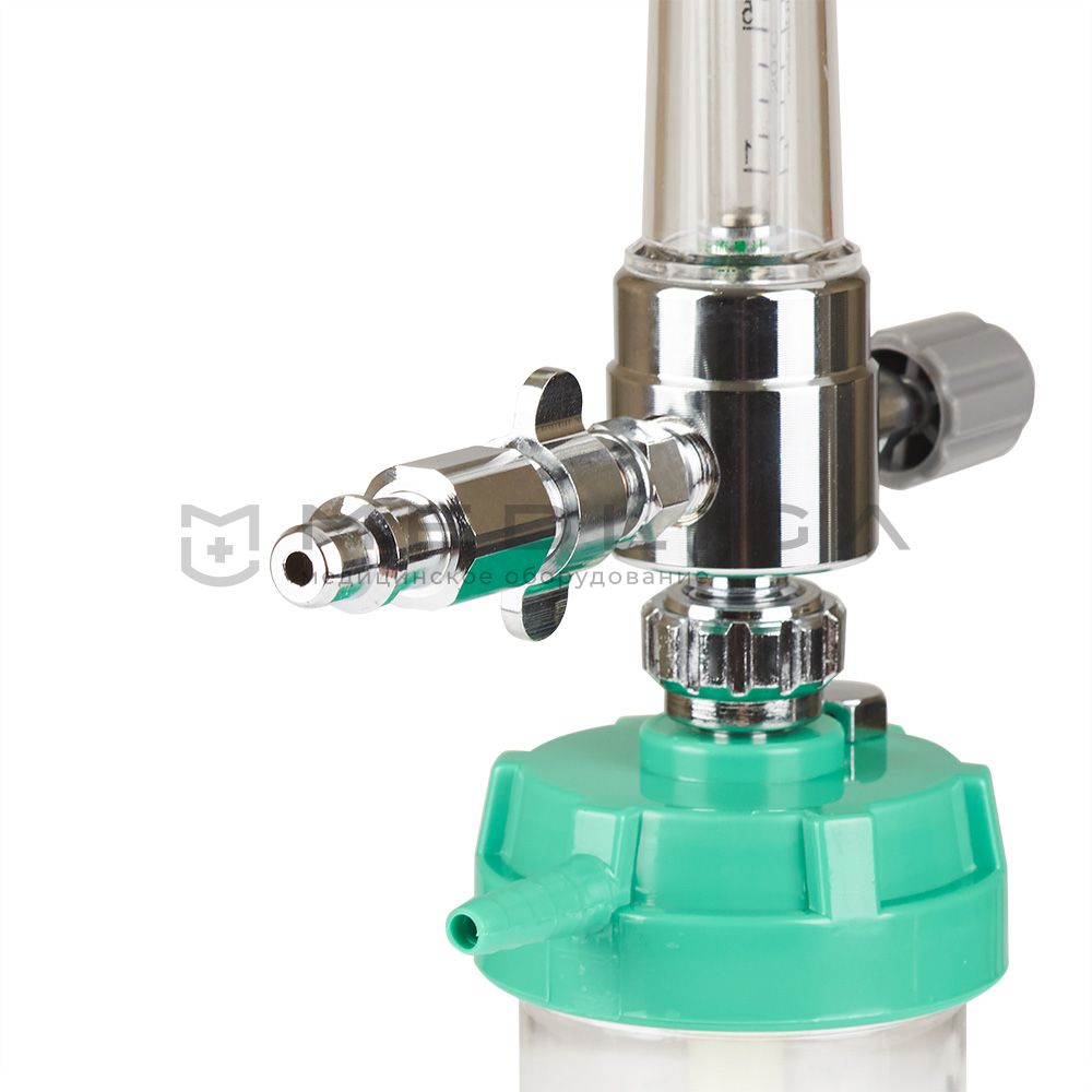 Увлажнитель кислорода оборудован стеклянным ротаметром с металлическим поплавком для определения уровня расхода жидкости. А для контроля потока кислородной смеси имеется механический регулятор.