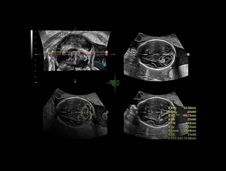 SonoCNS на основе ИИ выравнивает и отображает рекомендуемые проекции и результаты измерений при объемной 3D-визуализации мозга плода, тем самым поддерживая выполнение последовательных измерений и высокую эффективность.