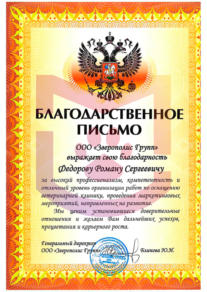 ГлавнаяОтзывыВетеринарные клиникиБлагодарственное письмо ООО "Зверополис групп"